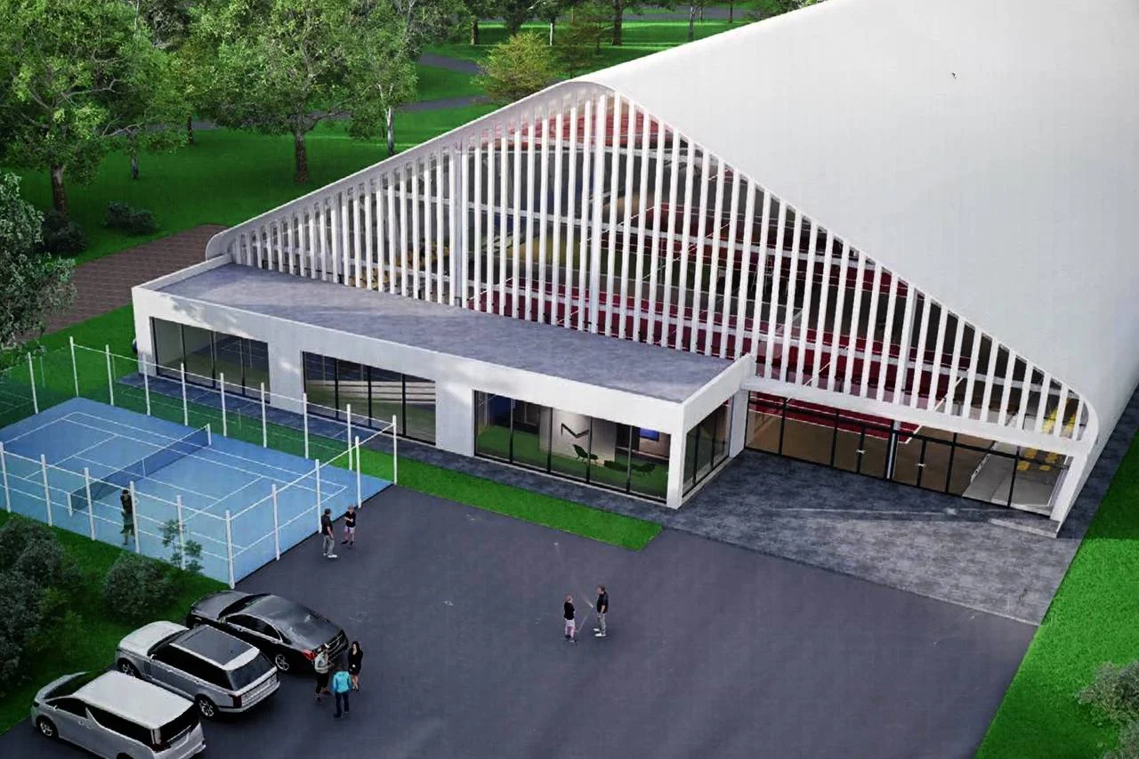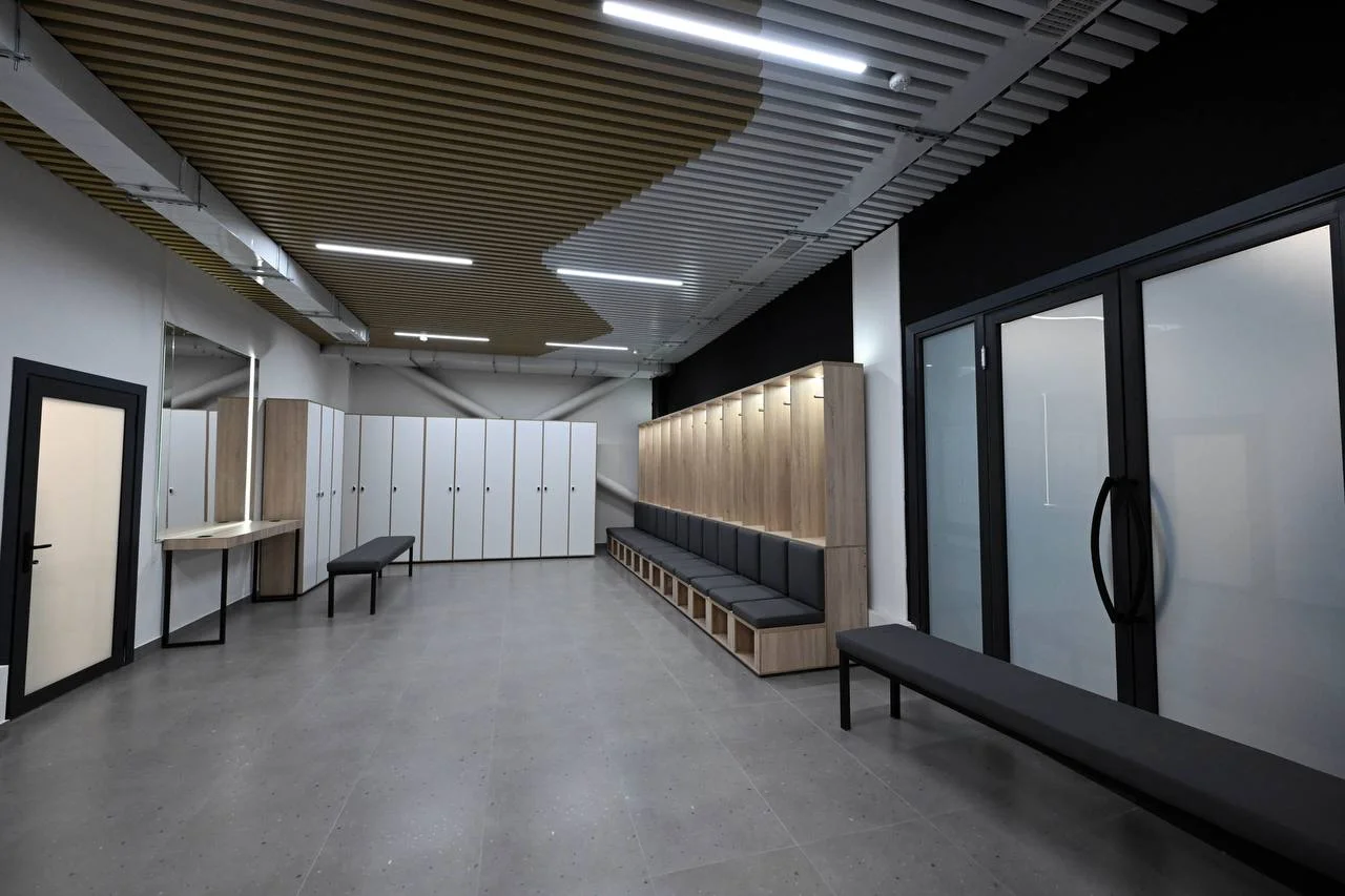 Подвальное помещение предназначено для парковки и технических нужд, в то время как на первом этаже размещены тренировочные залы, раздевалки, душевые и медицинский пункт. Второй этаж включает фуд-корт и зрительские трибуны, а на третьем этаже находятся VIP-зал и дополнительные места для гостей.